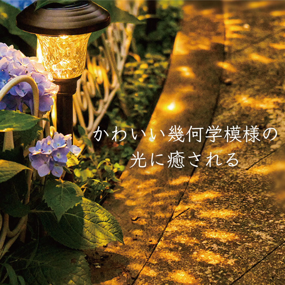 かわいい幾何学模様の光に癒される!庭園の景観灯に!IP44防水仕様!電気代0円のソーラー充電式!高転換効率ソーラーパネル採用!日中自動消灯!夜間自動点灯!白色!暖色!