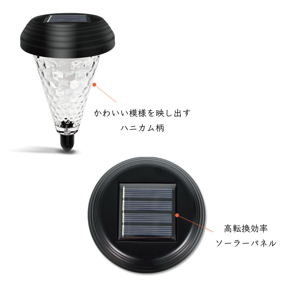 | 製品仕様004 | 【Point】 ・照度センサー内臓で自動点灯・自動消灯 ・安心のIP44防水仕様 ・電気代0円のソーラー充電式 ・おしゃれな幾何学模様を映し出すハニカム柄 ・クールでシャープな白昼色と温かみのある電球色 |