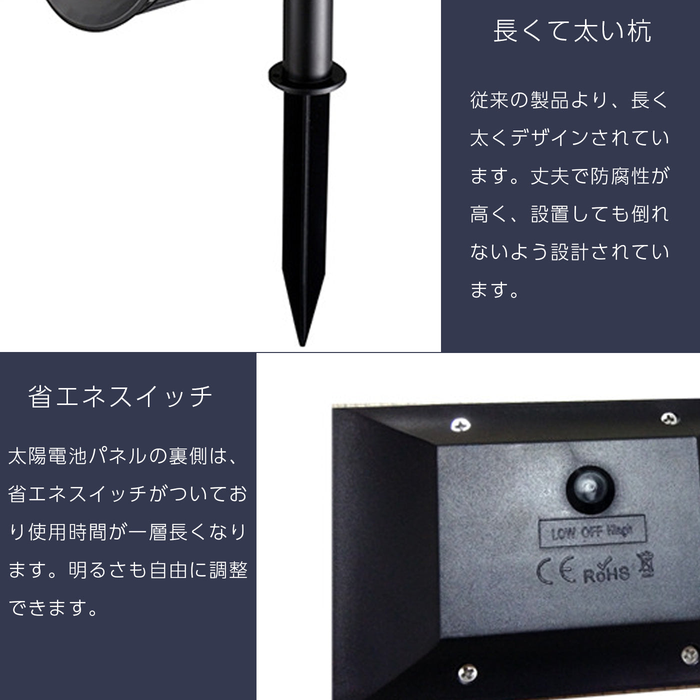 | 製品仕様004 | 【Point】 ・電池不要のソーラーパネルを搭載し、電気代0円を実現しました! ・しっかりと明るい光で照らすLEDライトで、ライトアップに最適です。 ・簡単設置でどなたでも簡単に扱えます。 ・IP65防水 |