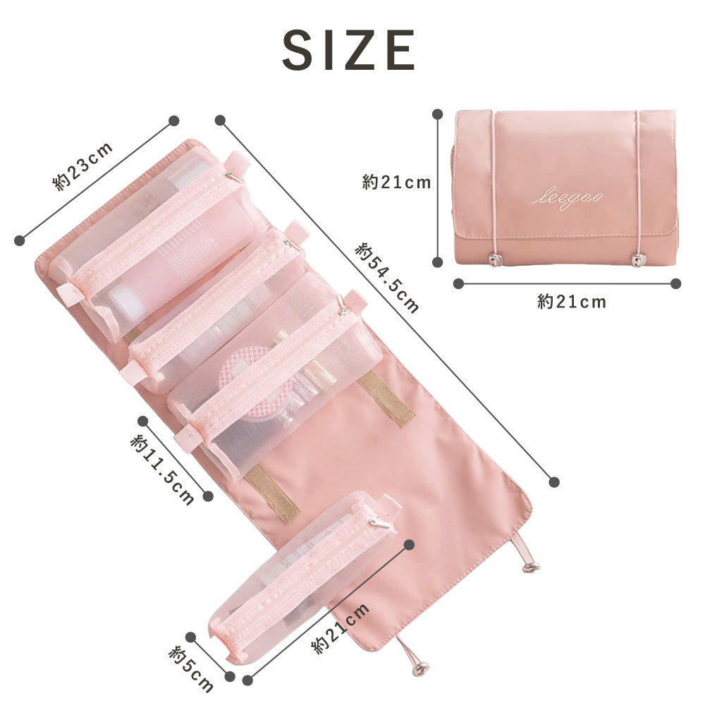 | 製品仕様004 | 【Point】 ・取り外し可能な、メッシュ素材の大小ポーチ4つ ・スーツケースやカバンに収まるサイズ感 ・コンパクトなのに大容量 ・2way仕様のゴム紐で壁掛け収納としても使える ・選べる6カラー |