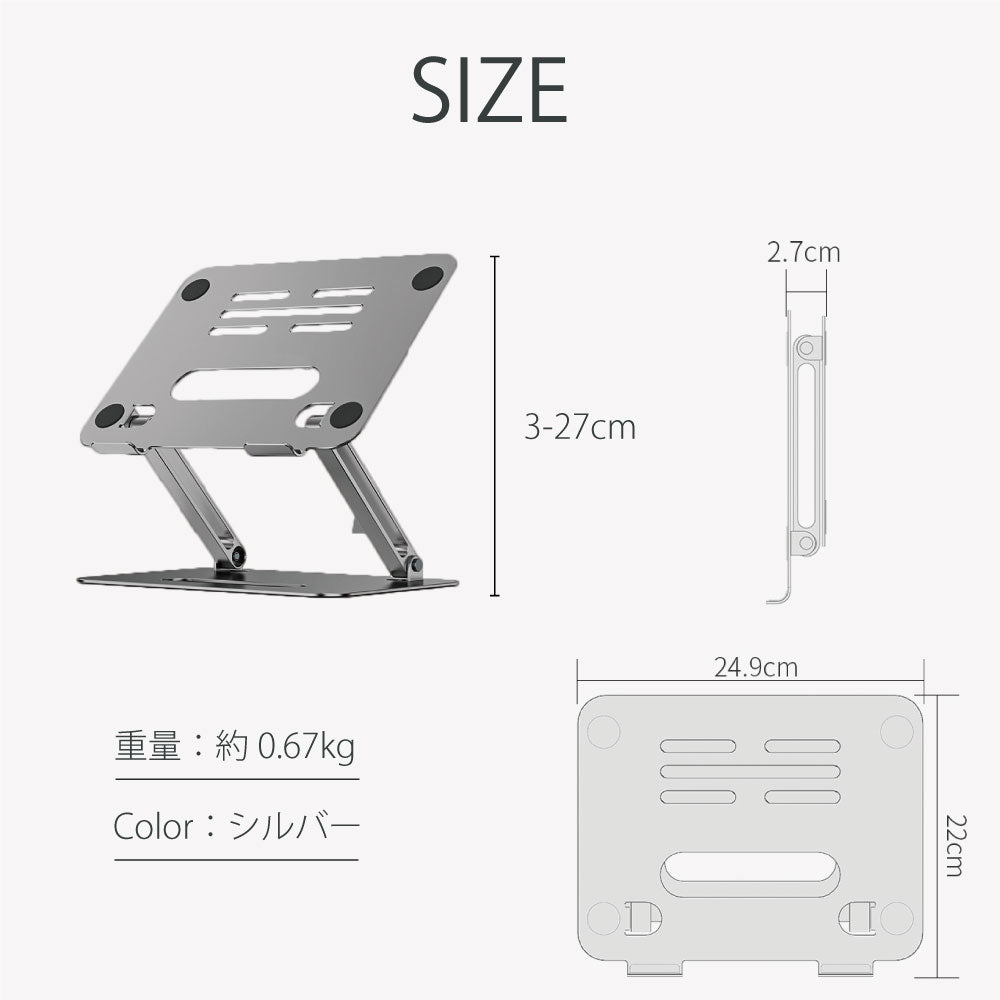 | 製品仕様004 | 【Point】 ・無段階の角度&高さ調節可 ・抜群の安定感!最大耐荷重約20kg ・おしゃれな質感!Macと同じアルミ合金仕様 ・MacBook、iPad、ノートPC、7~17.3インチに対応 ・アルミニウム製で抜群の放熱性能 |
