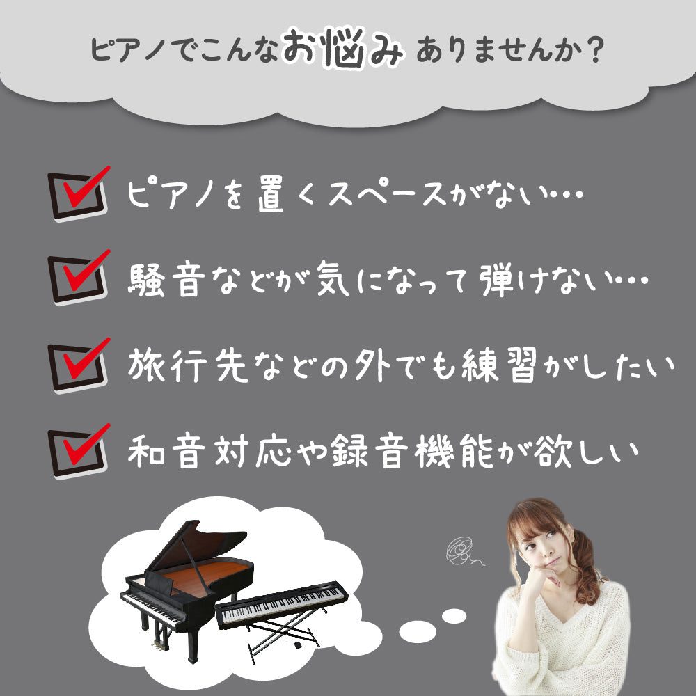 | 製品仕様003 | ・日本語取扱説明書付き ・和音対応 ・USBコード付属 ・スピーカー内蔵 ・市販のイヤホン接続で音が出せない環境でもご利用頂けます。 ・録音機能 ・フットペダル付き ・節電機能 ・音量・テンポコントロール機能 ・140種類の音色に変更可能 |