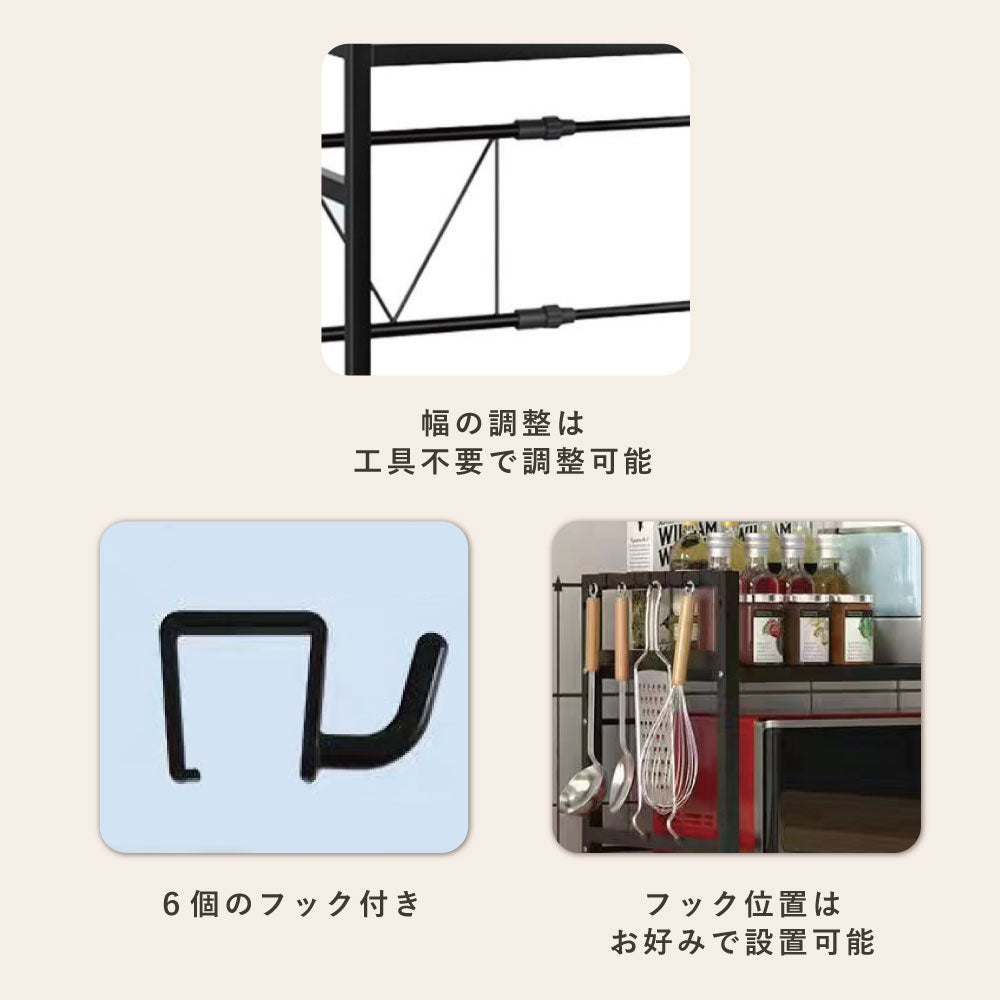 | 製品仕様004 | 【Point】 ・レンジ上のデッドスペースを有効活用 ・炊飯器も余裕で置ける!耐荷重30kgのスチールフレーム ・大型レンジにも対応!レンジの幅に合わせて伸縮 ・各脚毎のアジャスターで高さを微調整可能 ・お掃除カンタン!防水・防サビ加工 |