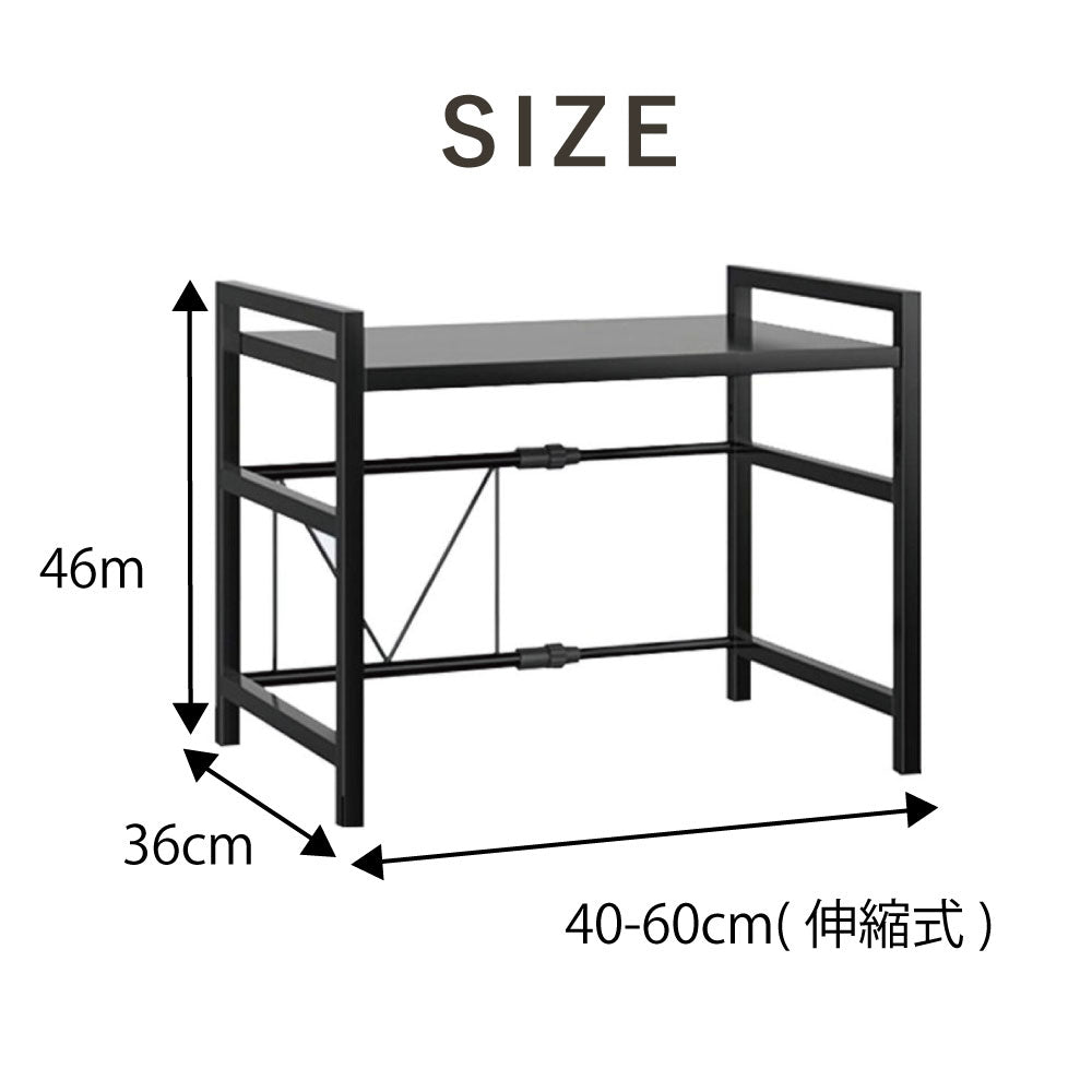 キッチン周りをスッキリ片付け!レンジ上のデッドスペースを有効活用!炊飯器も置けるスチールフレーム!レンジに合わせて41〜64cmまで伸縮!お掃除カンタン防水・防錆加工