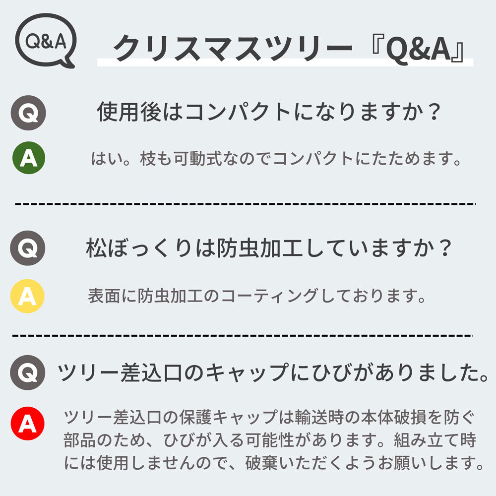 | 製品仕様003 | ・北欧風デザイン ・本物の松ぼっくり付き ・高品質でリアルな枝葉 ・簡単組立 ・簡単設置 |