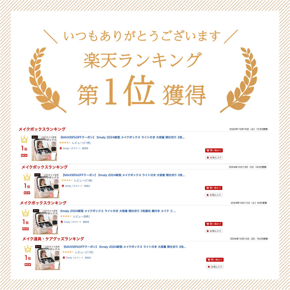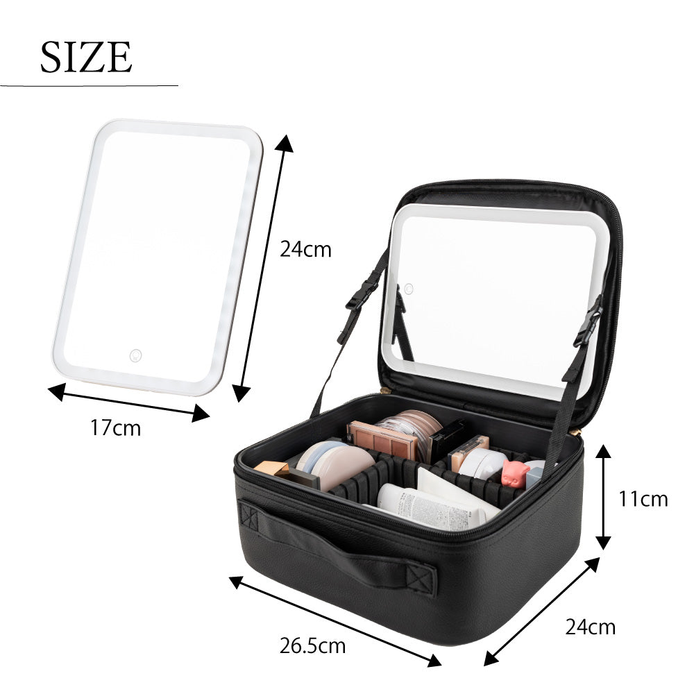| 製品仕様004 | 【Point】 ・取り外し可能な3色調光付きライトミラー ・コンパクトで大容量!自由に仕切りレイアウト ・インテリアに馴染むシックなデザイン ・ストラップで簡単調節!ミラー角度調節可能 ・旅行先でいつものメイクを!USB充電で持ち運び便利 |