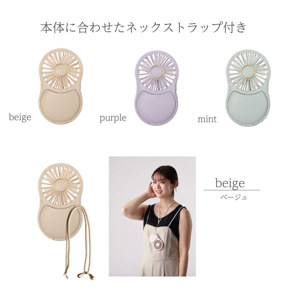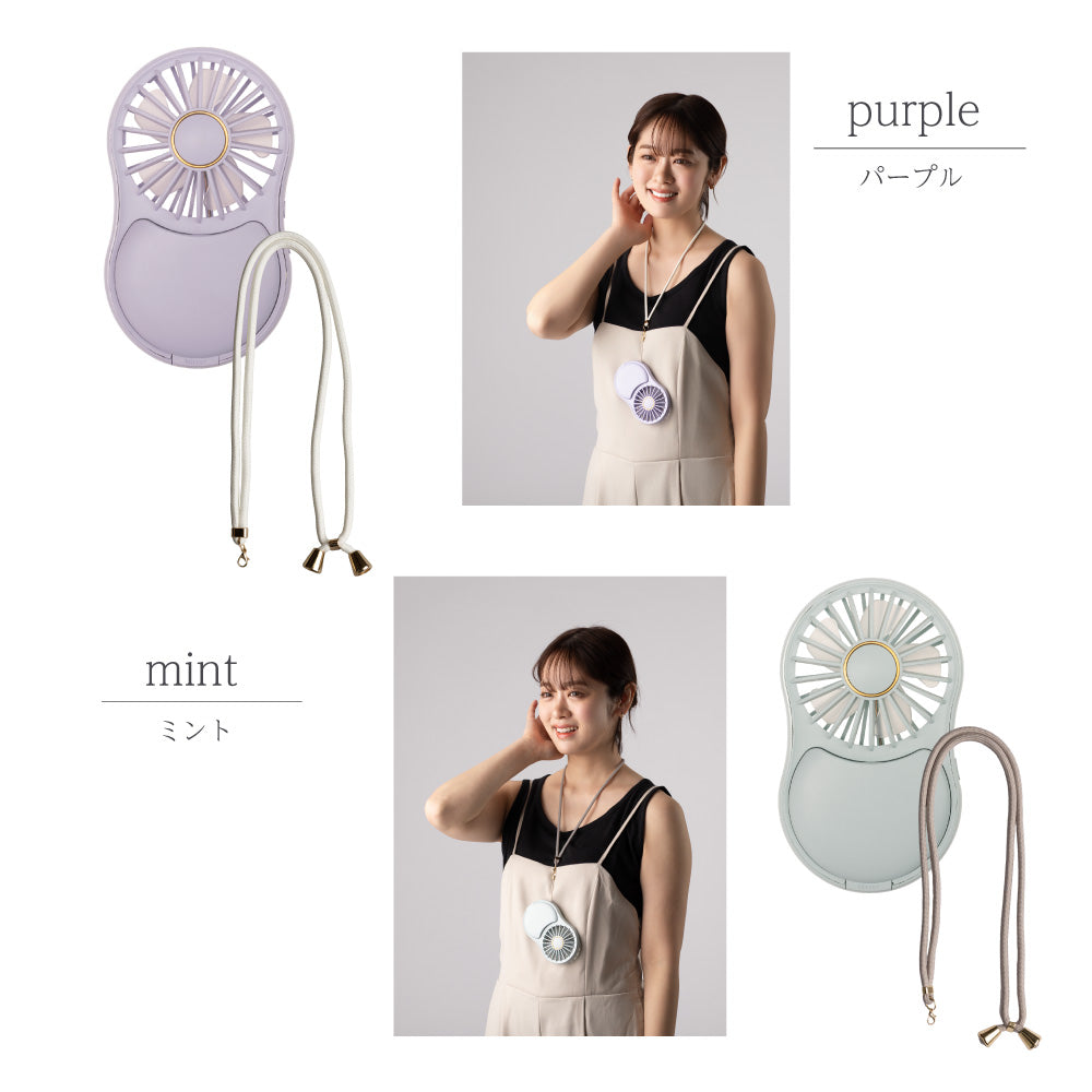 安心の日本メーカー★暗い場所でも確認できるライトミラー付きハンディファン スタンド付きで卓上使用。誤動作防止の長押し電源ボタン。長さ調節可能な丸紐ストラップ付き!軽量約107g