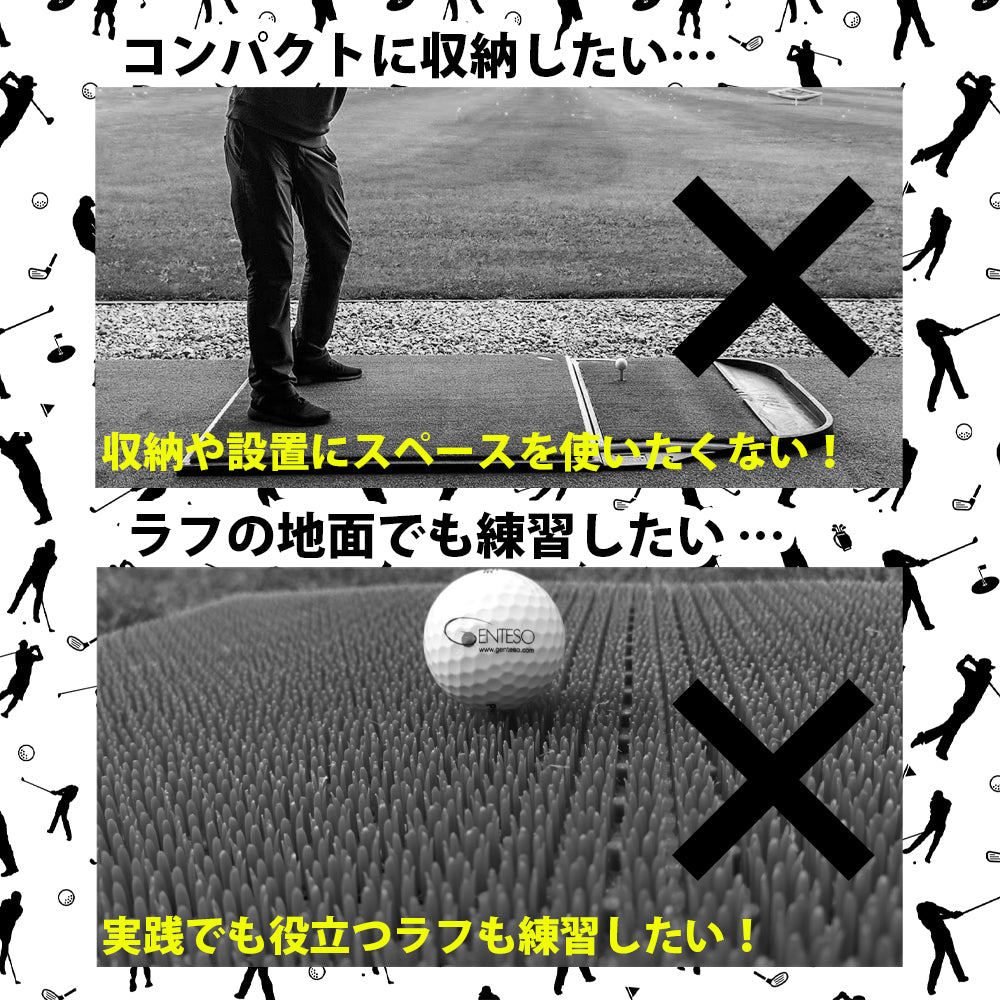 | 製品仕様004 | 【Point】 ・フェアウェイ/ラフの2way仕様 ・ラフの人工芝には芝目アリ ・ズレにくいゴム製マット ・持ち運びと収納が簡単 ・ティーを差して練習可能! |
