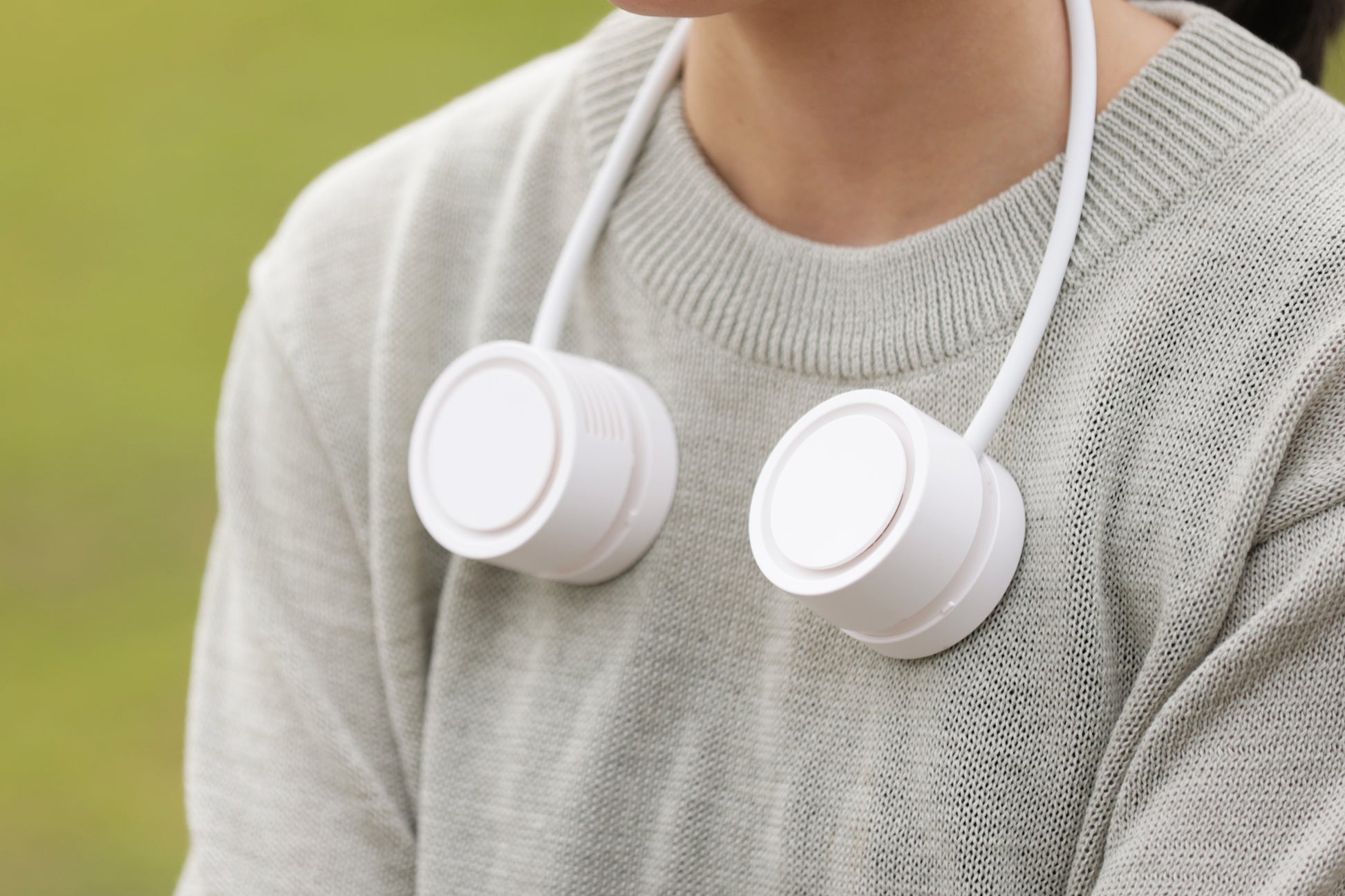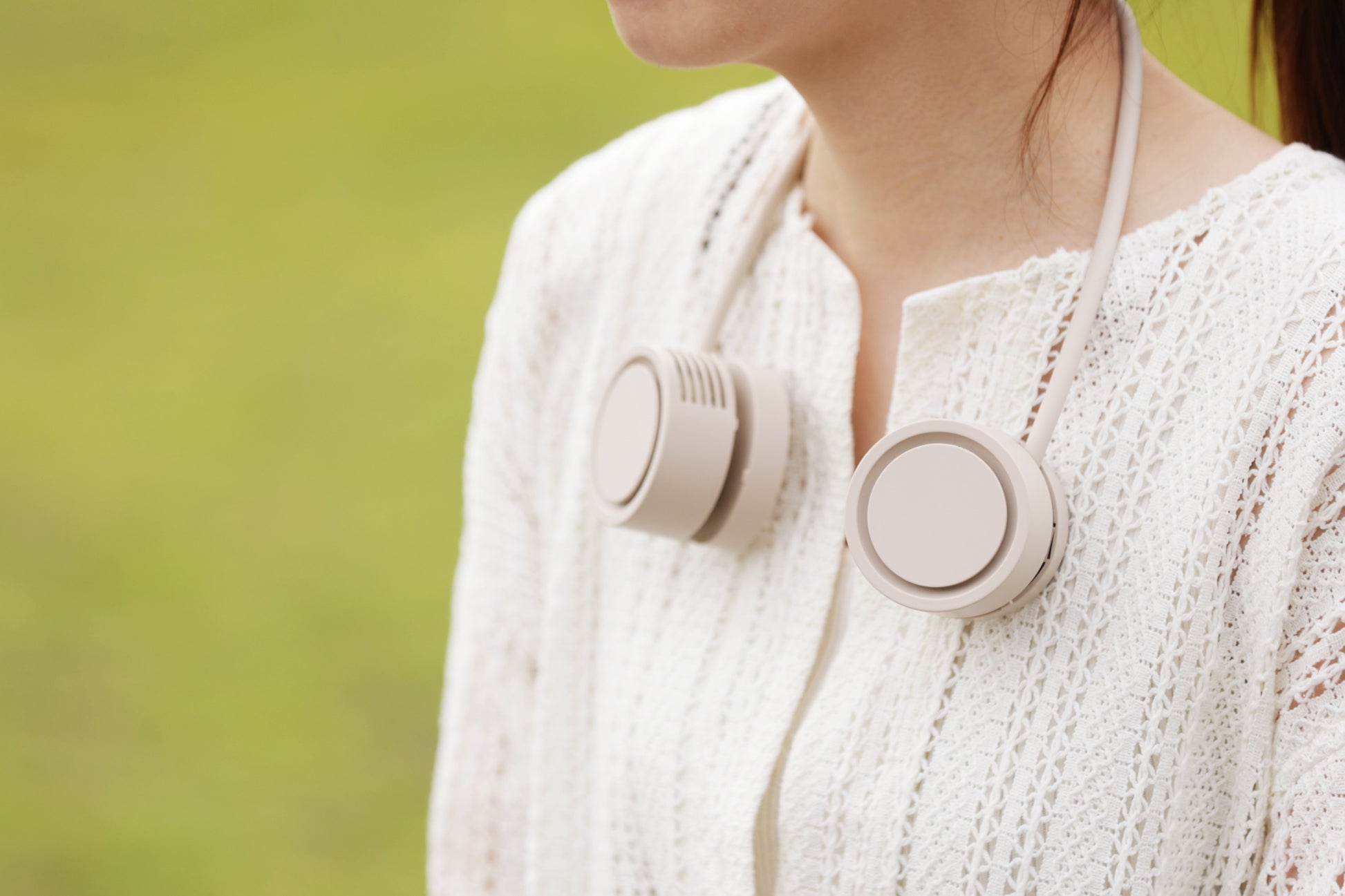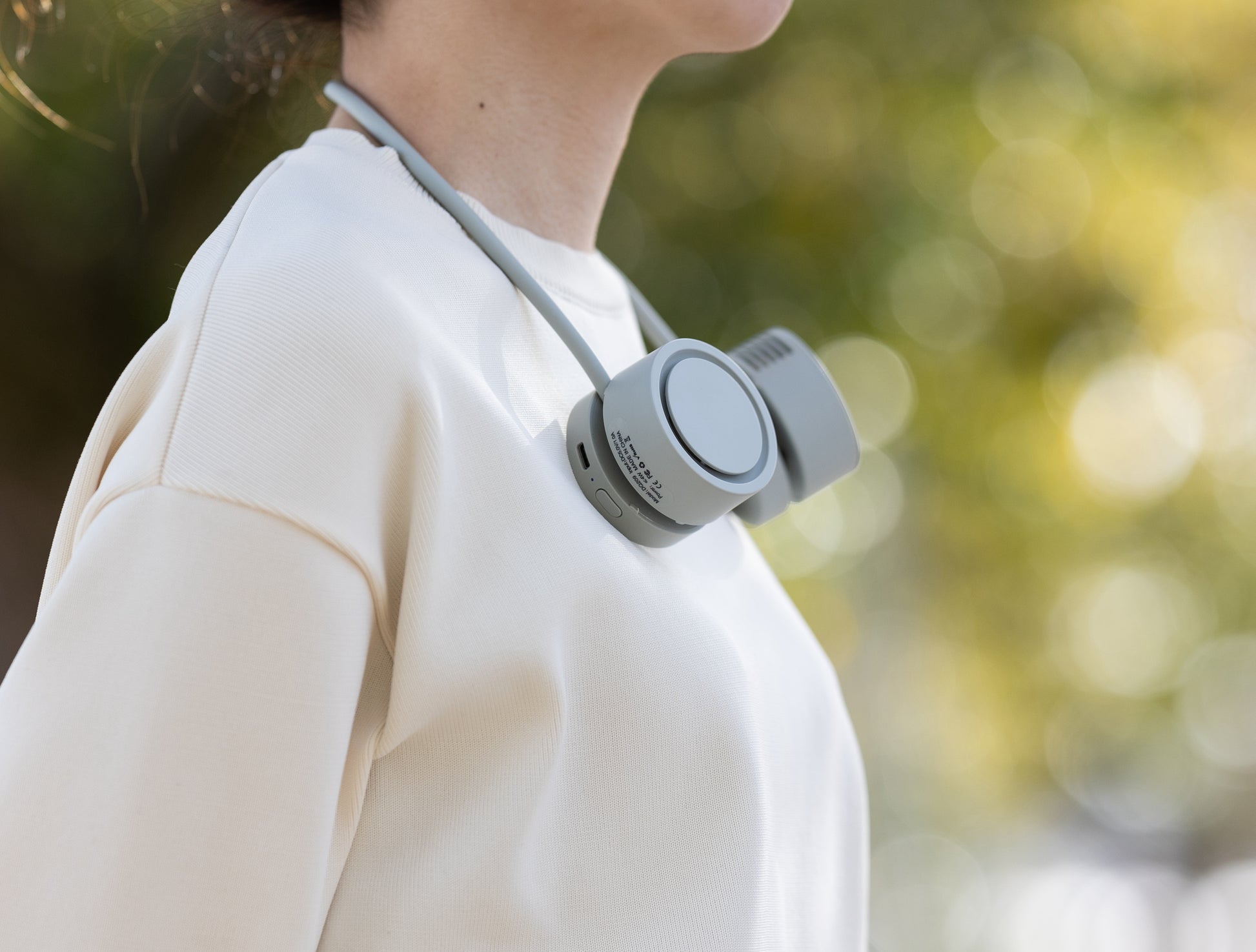 - くるくる巻いてコンパクトに収納できるネックファン。収納ポーチ付きでお出かけにも便利