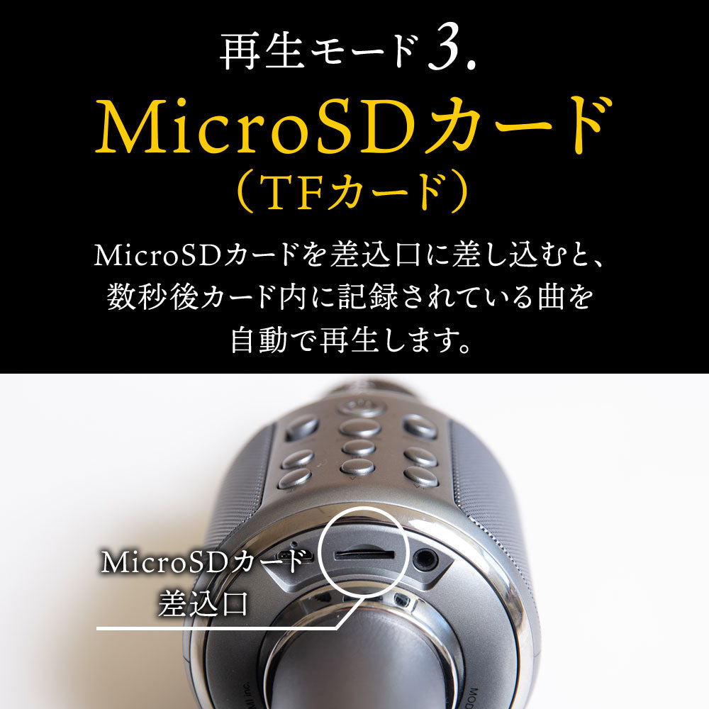 | 製品仕様001 | ・カラー:グレー ・Bluetooth搭載でスマホやPCと接続可能 ・最大7時間連続使用の充電式 ・2人同時に歌えるデュエットモード ・高音質スピーカー内蔵 |