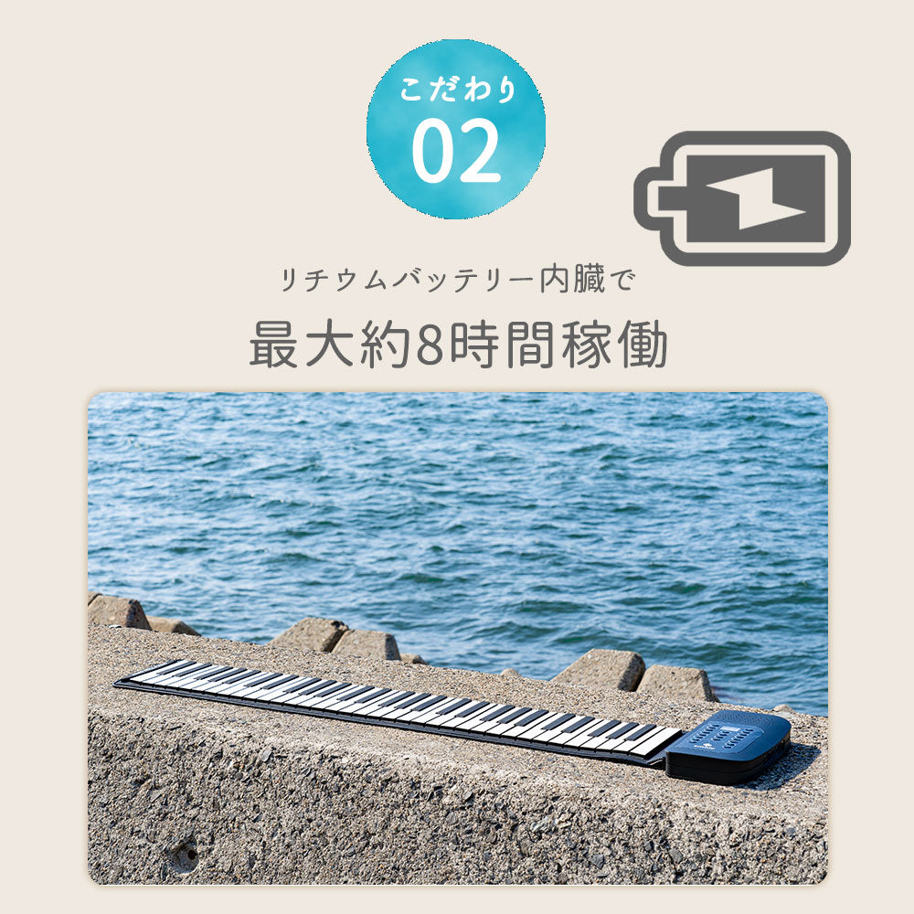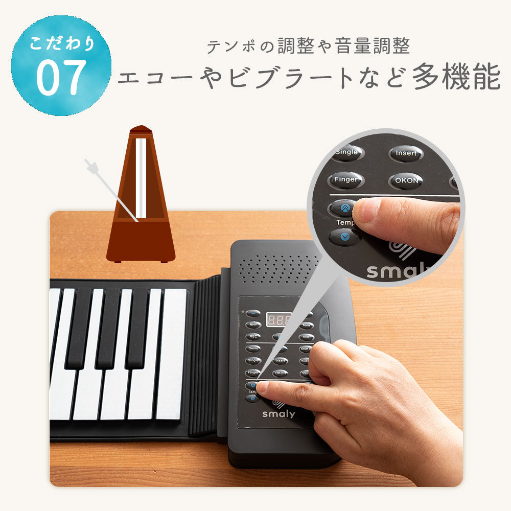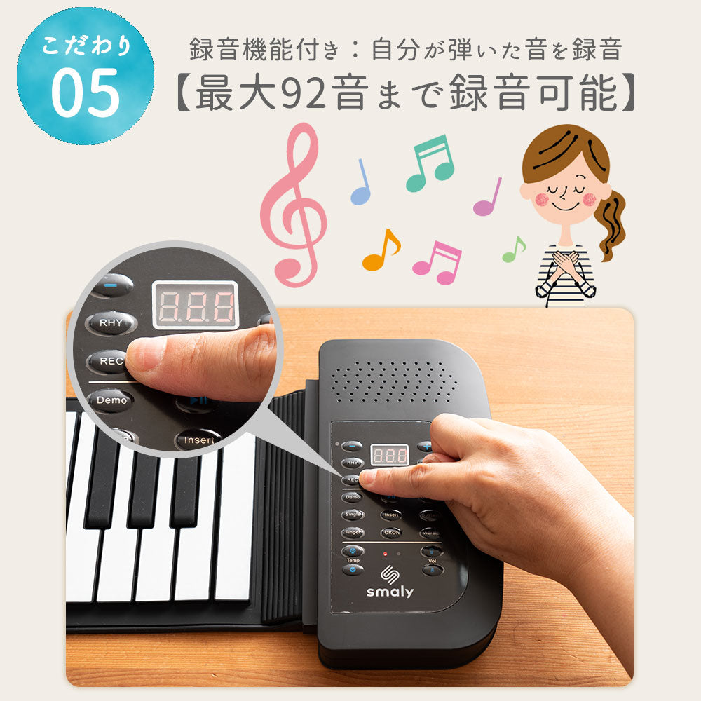 | 製品仕様003 | ・日本語取扱説明書付き ・和音対応 ・スピーカー内蔵 ・市販のイヤホン接続で音が出せない環境でもご利用頂けます。 ・録音機能 ・節電機能 ・音量・テンポコントロール機能 ・129種類の音色に変更可能 ※こちらの商品はシリコン製のためまれに連打音やタッチを感知せず音が鳴らない場合があります。予めご了承下さい。 |