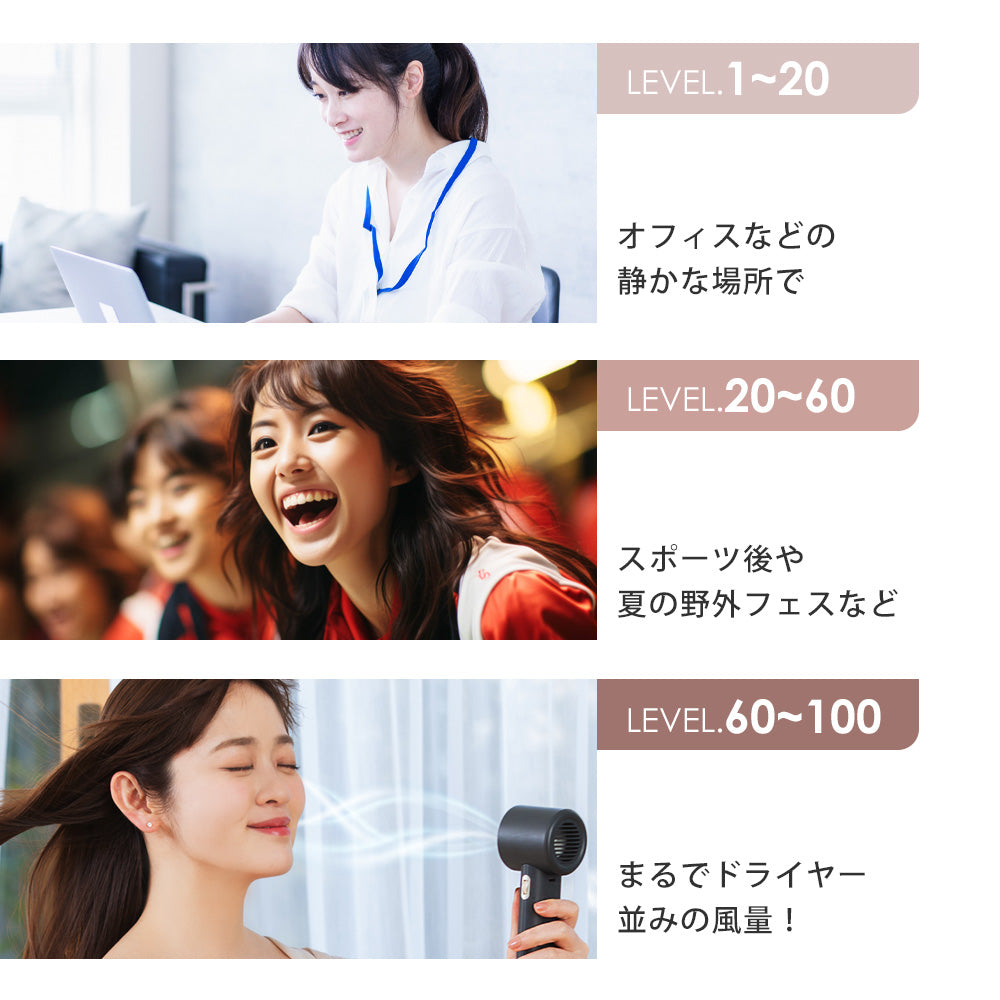 ・電車など静かな場所では、1-20段階で。暑い屋外では21-100段階でご使用ください。